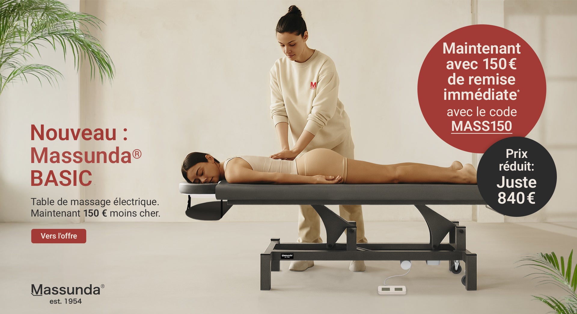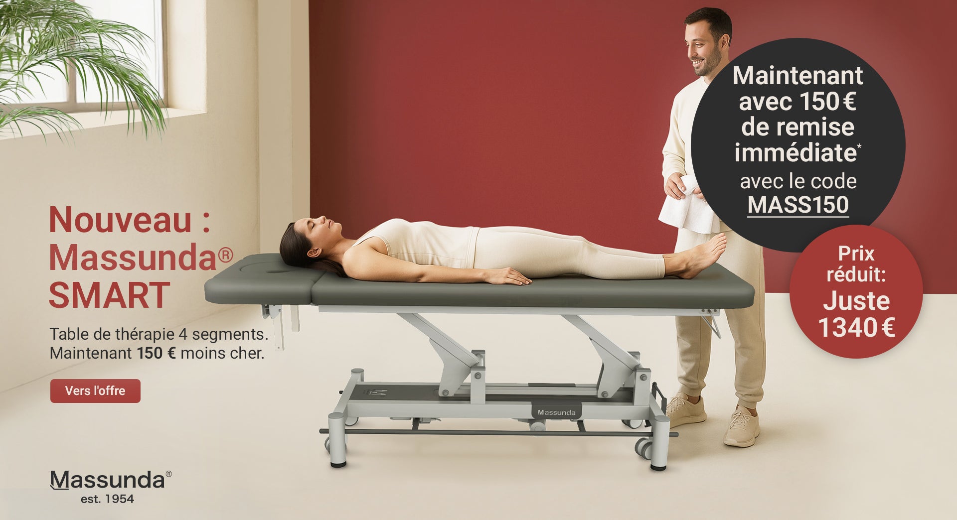 L’offre est valable jusqu’au 31 octobre 2025 inclus. La réduction de 150 € s’applique exclusivement aux modèles suivants : Massunda® BASIC et Massunda® SMART. La réduction ne peut pas être cumulée avec d’autres bons ou remises.