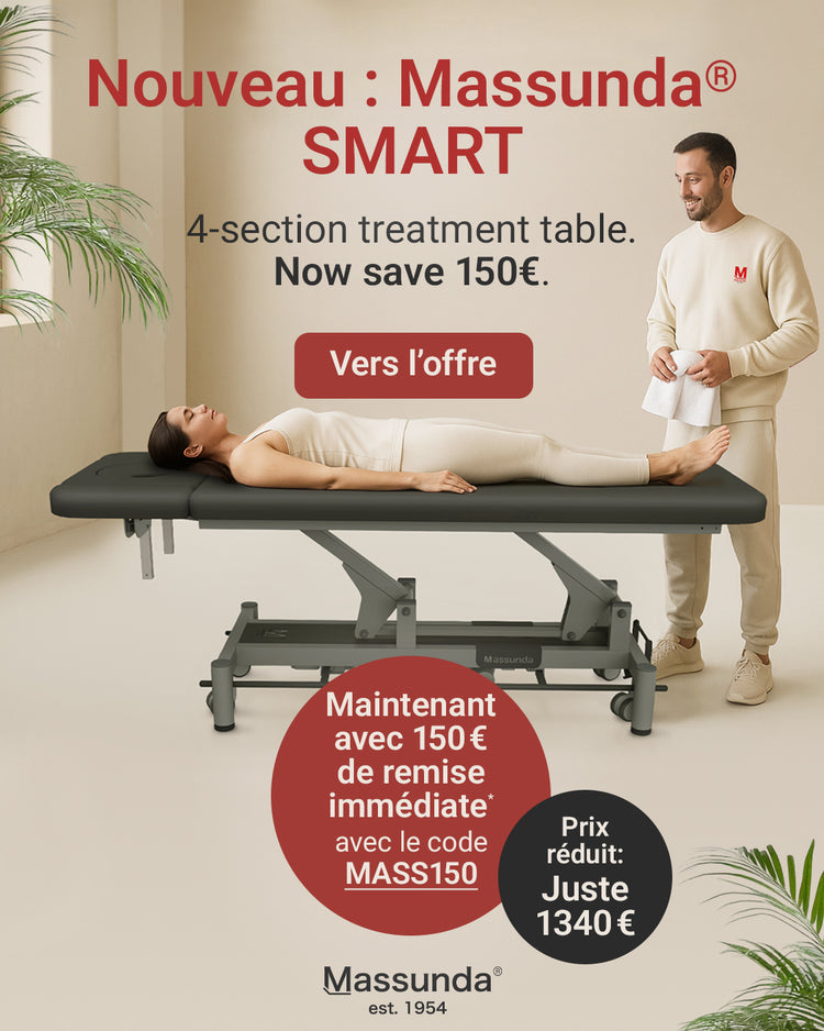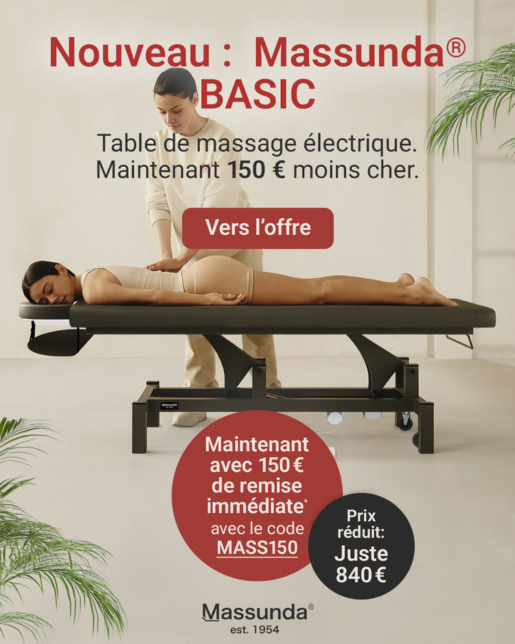 Aucun massothérapeute ne peut se passer d'une table de massage fonctionnelle. C'est un élément essentiel à l'exercice de sa profession et elle doit parfaitement répondre aux besoins individuels du praticien. Chez Massunda®, fabricant de tables de massage, nous vous accompagnons à chaque étape. Nous veillons à ce que vous disposiez de tous les outils nécessaires pour offrir à vos patients un traitement optimal et laisser une impression durable.